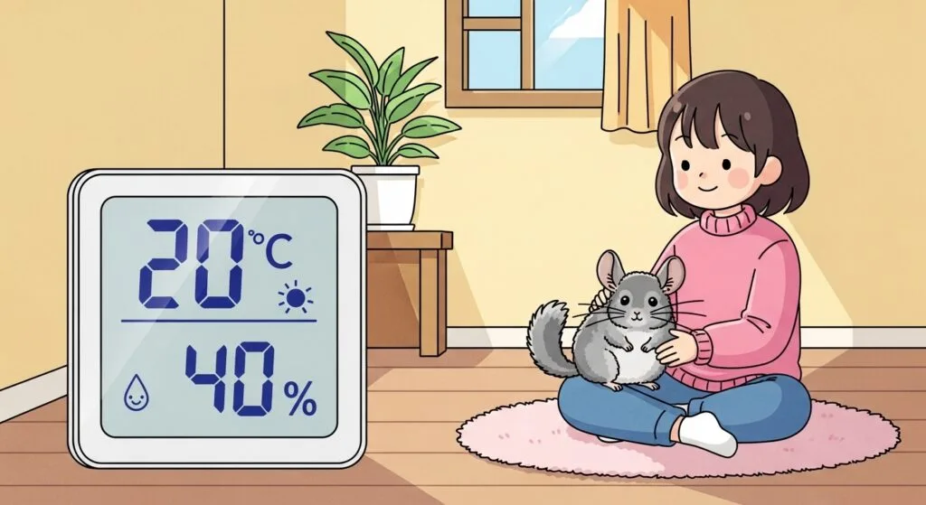 湿度だけじゃなくて、温度もセットで考えるのがコツです。チンチラにとっての適温は、だいたい18度〜22度くらい。