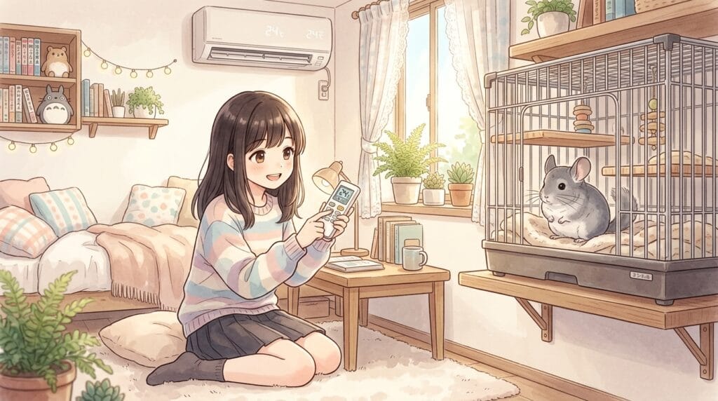 チンチラが快適に過ごせる温度は、だいたい18度から23度くらい。湿度は40%から60%がベスト。これ、人間にとっては「ちょっと涼しいかな?」くらいの設定なんだ。