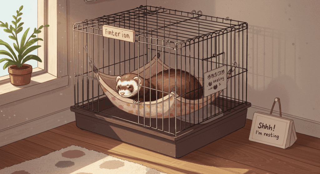 目安としては、2~3日は静かに見守ってあげて、フェレットがケージの中でリラックスして寝たり、ご飯を食べたりし始めたら、次のステップに進むサインだよ。