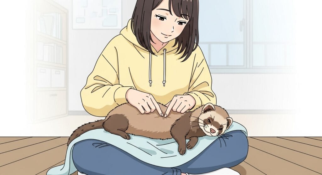 フェレットちゃんの体を優しくなでてみて、肋骨(胸のあたりにあるあばら骨)がどう感じるかでチェックするよ。