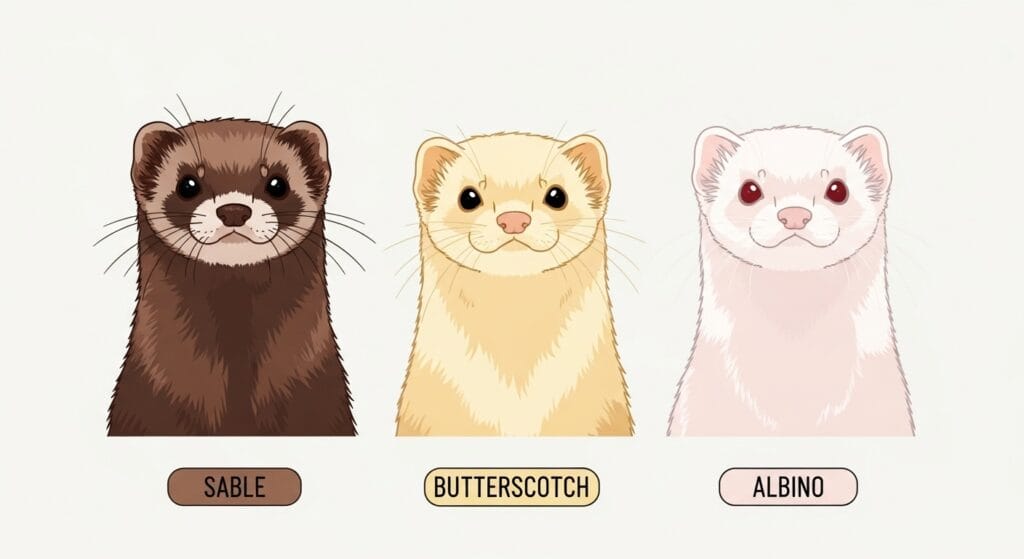 フェレットの毛色って、長い毛(ガード毛)と、その下にあるふわふわの短い毛(アンダーコート)の色の組み合わせで決まるんだ。まずは、色合いの基本となる代表的なカラーを紹介するね!