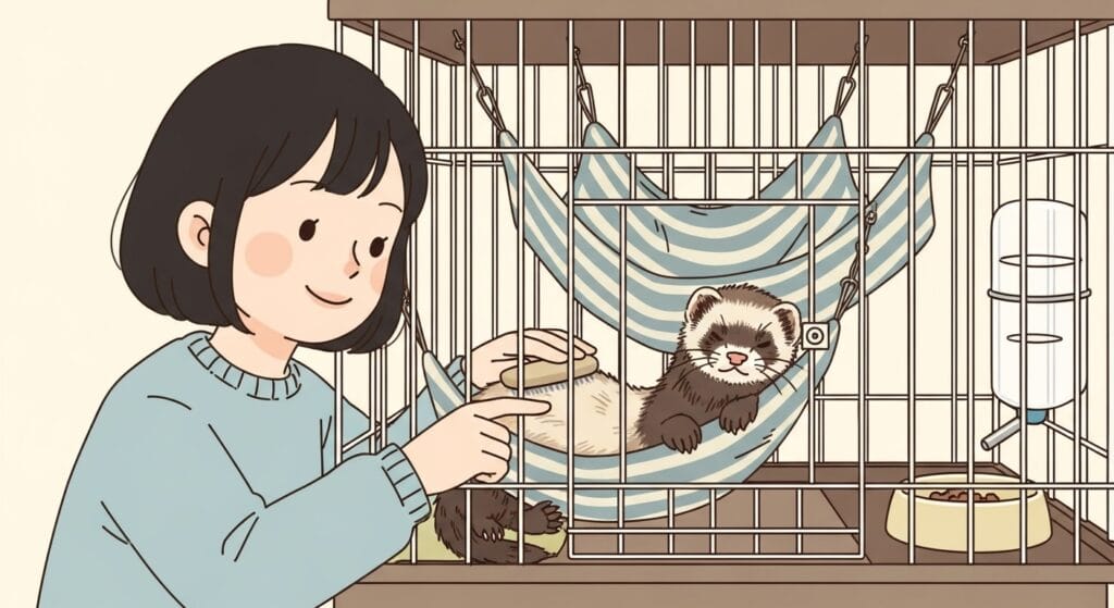特に毛の生え変わりの時期(換毛期)には、ブラッシングをしてあげると、古い毛が取れて新しい毛が生えやすくなるよ。毛並みが整うと、色ツヤもさらにアップして見えるんだ。ブラッシングは、フェレットちゃんとのコミュニケーションの時間にもなるから、優しくやってあげてね。