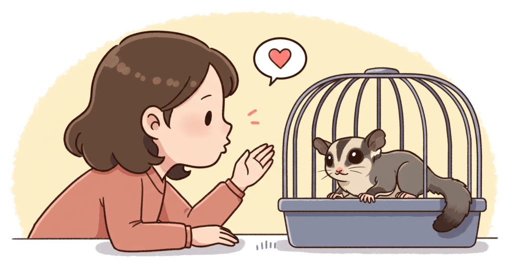 - 声をかける: ケージに近づき、優しく声をかけてあげましょう。「大丈夫だよ」「怖くないよ」と、飼い主さんの声を聞かせてあげるだけで、フクモモちゃんは安心します。この時、大きな声を出すと逆効果なので、ささやくようなトーンで話しかけてあげてください。