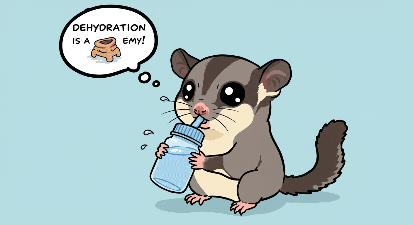 フクロモモンガは、特に夏の暑い時期や、冬に暖房で空気が乾燥していると、水分不足になりやすいです。うんちは、体に吸収されなかった食べ物の残りかすですが、これに水分が加わることで、スムーズに外に出ていきます。水分が足りないと、うんちがカチカチに硬くなってしまい、出にくくなってしまいます。