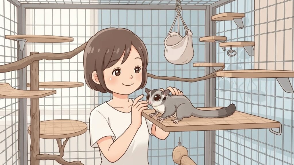 - レイアウト:ケージの中に、登れる木やロープ、ハンモック、そしてお気に入りの寝床(ポーチや巣箱)を設置してあげましょう。ポーチは布製だと温かいですが、爪が引っかからないように注意が必要です。