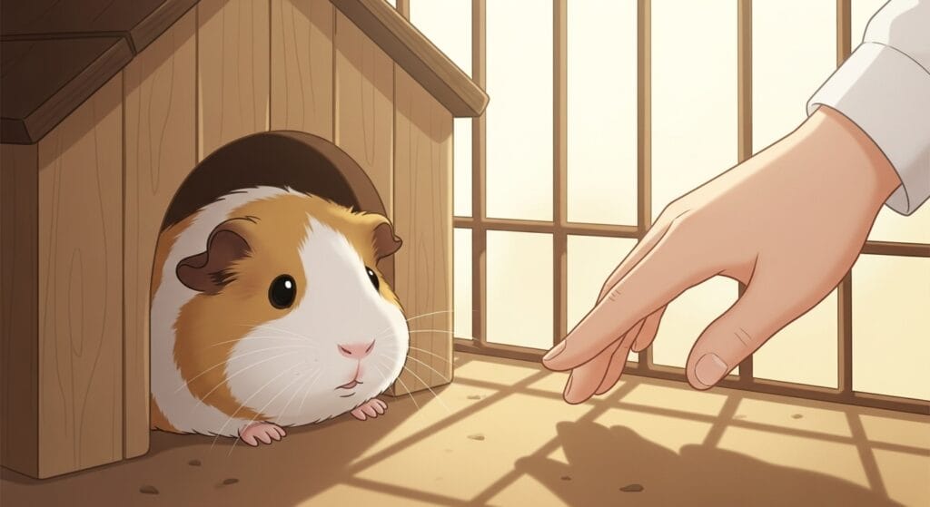 実はモルモットって、もともとは敵から身を守るために群れで生活してた動物。だからね、すっごく「警戒心が強い」し、「臆病」なんだ。ちょっとした物音にも敏感に反応して、ササッと隠れちゃうことが多いよ。