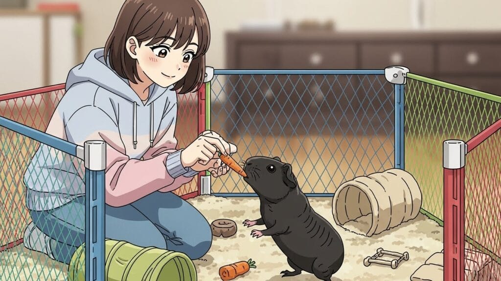 黒スキニーギニアピッグは、ほぼ毎日、ごはんの交換、ケージの掃除、そしてお肌のチェックや保湿などのお世話が必要です。また、彼らはとても賢く、コミュニケーションを必要とする動物です。ただ餌をあげて終わりではなく、毎日少しの時間でもいいので、抱っこしたり、撫でてあげたり、話しかけてあげる時間がとても大切です。