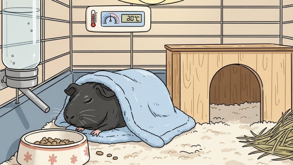 普通のモルモットはフサフサの毛皮を着ているから、ある程度の寒さには強いです。でも、黒スキニーちゃんはほぼ裸!だから、私たち人間と同じように、気温の変化にはめちゃくちゃ弱いんです。