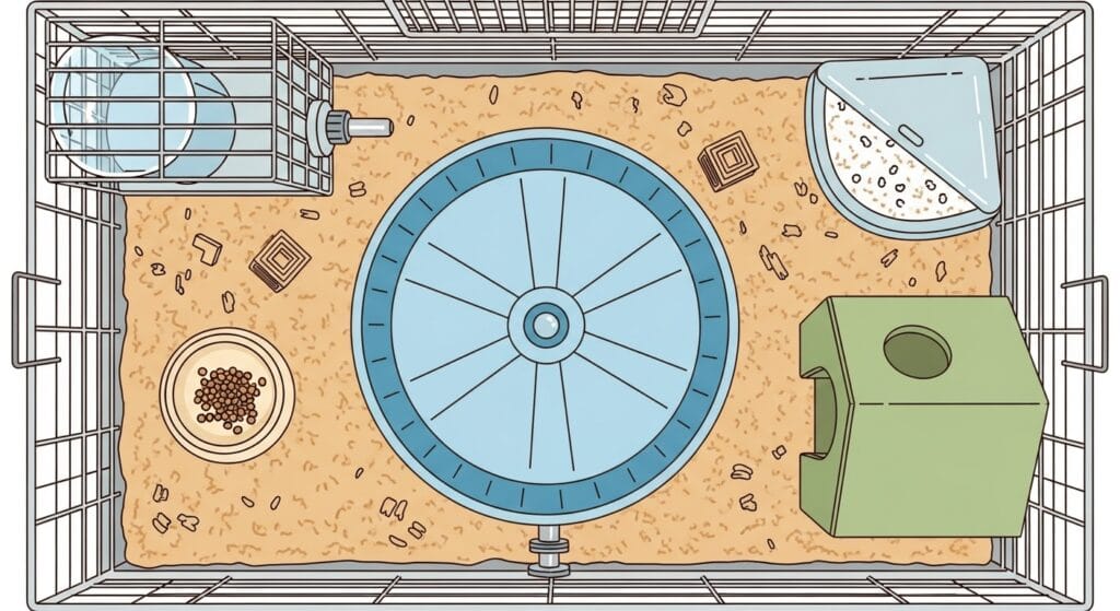 特に大切なのが「幅60cm」っていう数字!これより小さいと、ゴールデンハムスター用の大きめの回し車(直径21cm以上がおすすめ)を置くと、もうケージの中がギューギューになっちゃうんだ。