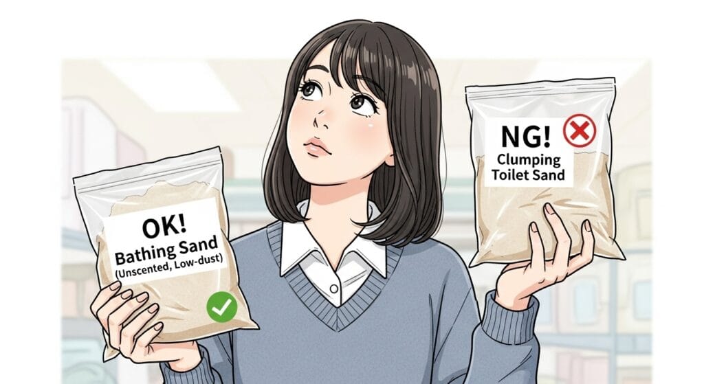 ・浴び砂(サラサラタイプ) これが砂浴び用!粒が細かくてサラサラしているのが特徴だよ。天然の鉱物(ゼオライトとか)が使われていることが多いんだ。このサラサラ感が、毛の間の皮脂や汚れを吸い取ってくれるんだ。