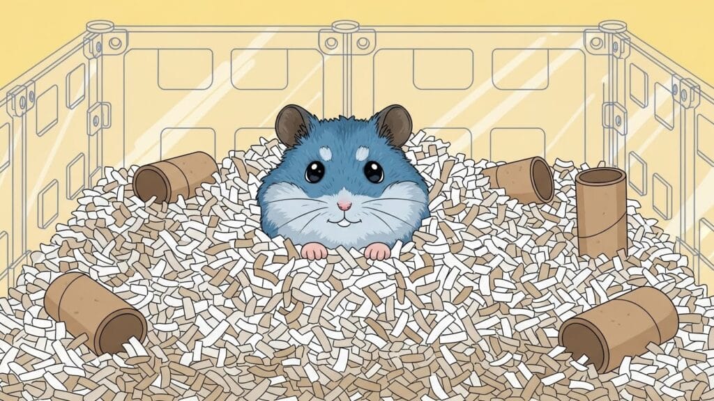 主に使われるのは、広葉樹(こうようじゅ)のチップや、紙製の床材(ペーパーチップ)だよ。アレルギーを起こしにくいのは、紙製の床材や、アレルギーの原因になりやすい針葉樹(スギやヒノキ)を使っていない広葉樹のチップだと言われているよ。ホコリが舞いにくいものを選ぶと、ハムスターの鼻や目にも優しいからチェックしてみてね!厚さは5cmから10cmくらい、たっぷり敷いてあげて!