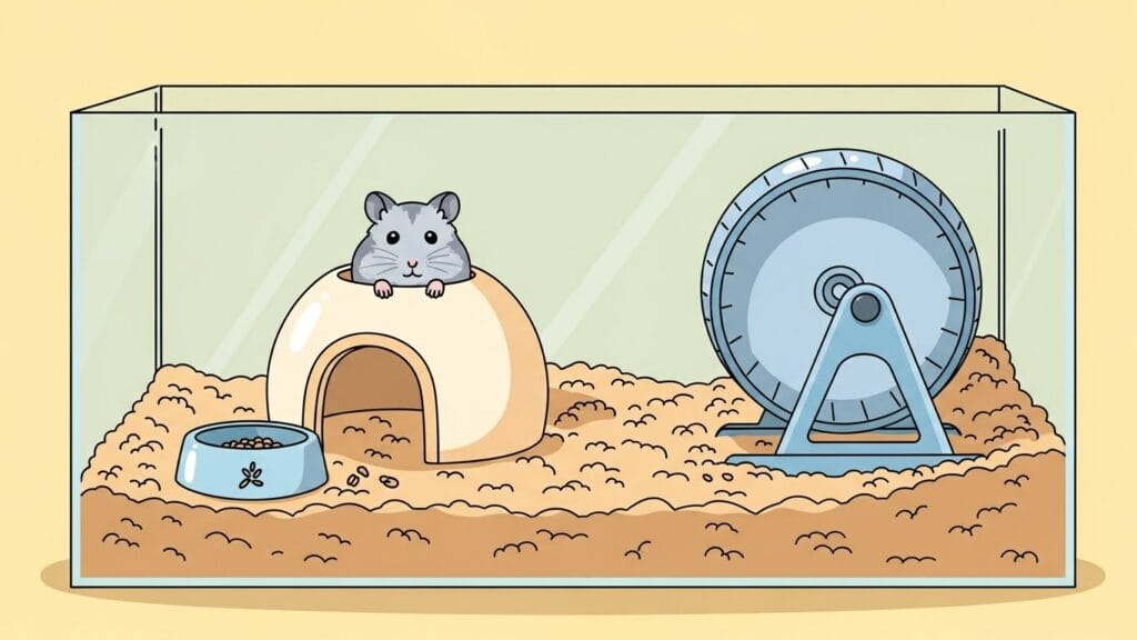 ドワーフハムスターだからって、小さなケージでいいわけじゃないよ!ハムスターは夜になると、すっごく活発に動き回るから、できるだけ広いケージを用意してあげてほしいな。目安としては、幅40cm以上あると安心だよ。