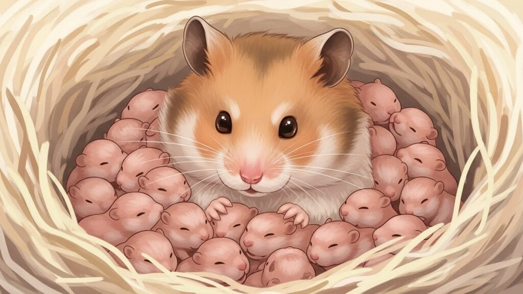 実は、ゴールデンハムスターは、10匹を超える赤ちゃんを産むことも珍しくないんだよ。中には、なんと15匹とか、もっとすごい数だと20匹近くの赤ちゃんを一度に産んだ!っていう記録もあるんだって!