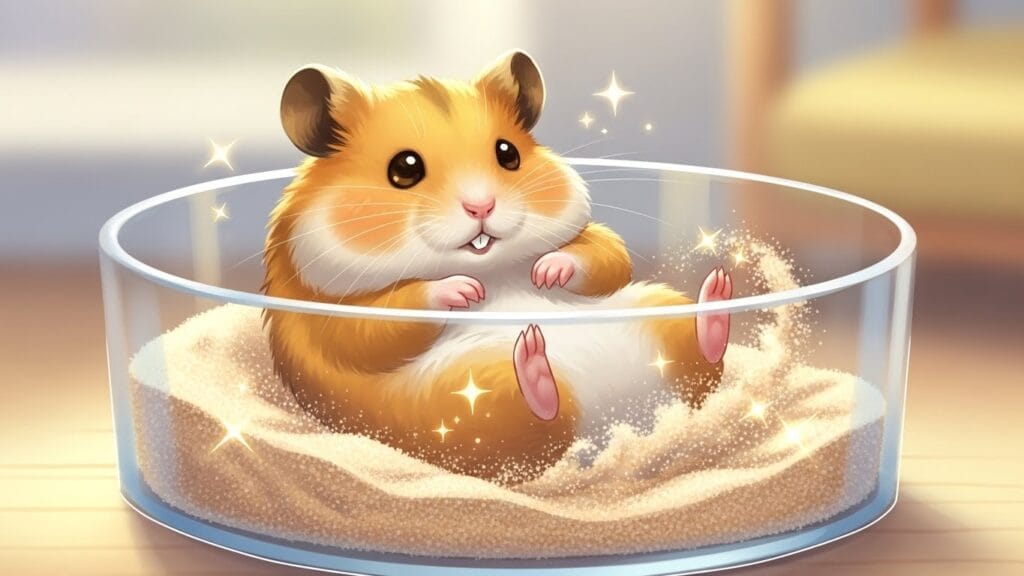 野生のゴールデンハムスターは乾燥した場所に住んでいるので、水でお風呂に入ることはありません(というか、水に濡れるのは大嫌いですし、体温が下がって危ないんです)。その代わりに、細かい砂に体をこすりつけることで、毛の間に溜まった脂分や汚れを落とします。人間でいうところの、ドライシャンプーみたいな感じですね。