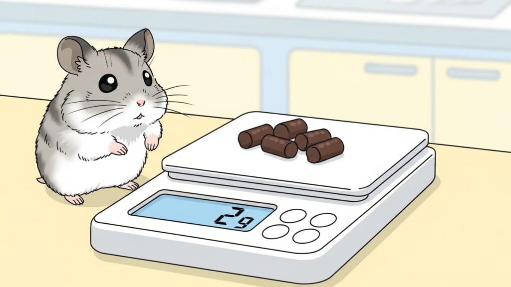 「だいたいこれくらいかな〜」っていう目分量は、ジャンガリアンにとっては結構リスキー。ペレット(ハムスター専用の固形フード)の種類によっても、1粒の重さが全然違うからね。