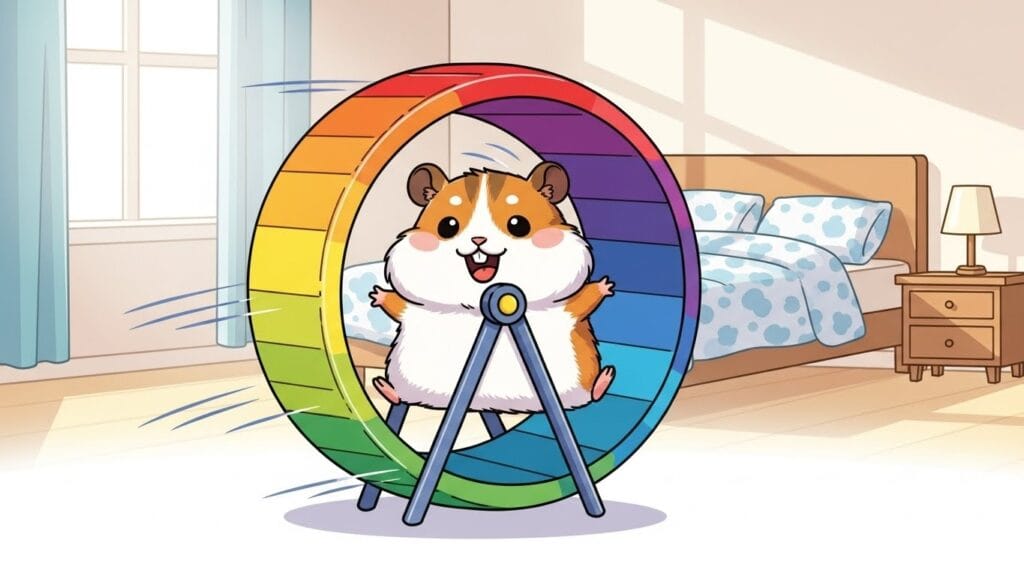 ハムスターといえば、夜中に一生懸命走る「回し車」。 これも、体のサイズに合わせて変える必要があるんだ。ジャンガリアンなら直径15センチくらいのものでOKだけど、キンクマがそれを使うと、背中が反り返っちゃって腰を痛めちゃう。キンクマには20センチ以上の大きな回し車が必要。