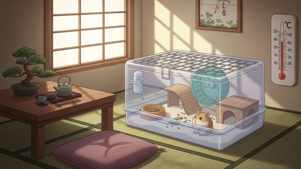 ジャンガリアンは暑さにも寒さにもめちゃくちゃ弱い。夏は25度くらい、冬は20度くらいをキープするのが理想なんだ。エアコンをつけっぱなしにするのは電気代が気になるかもしれないけど、ハムスターの命を守るための必要経費だと思って割り切ろう!