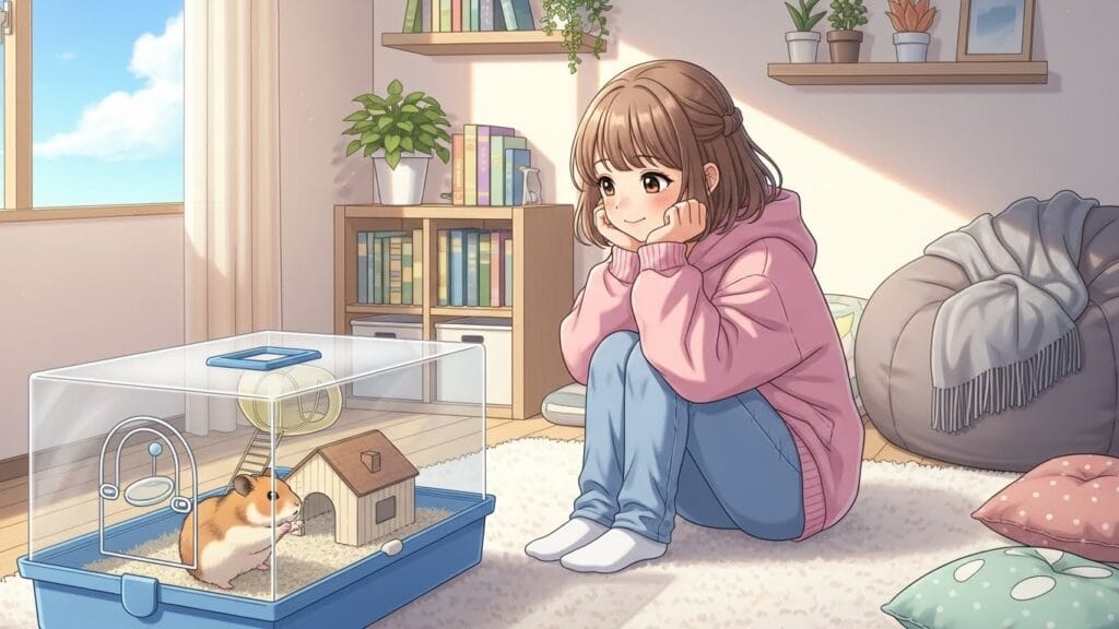 「最近、夜になっても回し車で遊んでないな」って思ったら、それは体力が落ちてきた証拠。無理に起こさず、静かに寝かせてあげてね。寝床の近くに新鮮な水とご飯を置いて、移動の負担を減らしてあげるのがベストだよ。