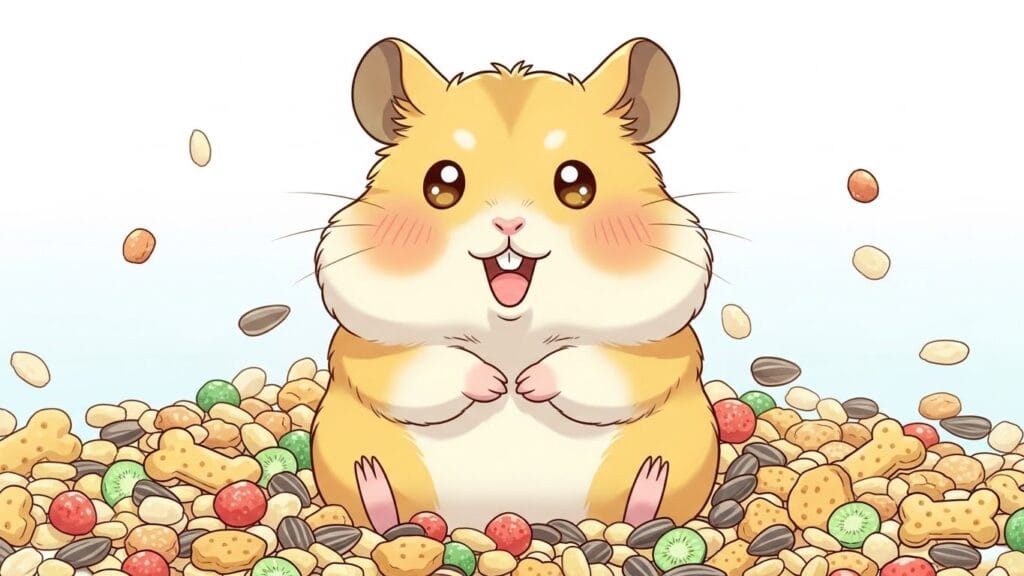 主食である「ペレット」は栄養満点だけど、おやつをたくさんもらえると、ハムちゃんは「美味しいおやつまでお腹を空けておこう」と計算しちゃうんです。主食を食べずに副食(おやつ)ばかり食べるのは、栄養バランスが崩れる原因になります。