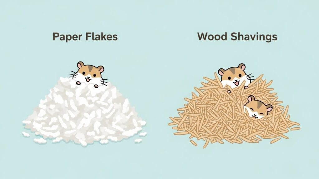 僕のオススメは「紙の床材(ペーパーフレッシュ)」。おしっこをしっかり吸い取ってくれるし、色が白いからおしっこの色をチェックできて、健康管理もしやすいんだ。ニオイを閉じ込める力も結構強いよ!
