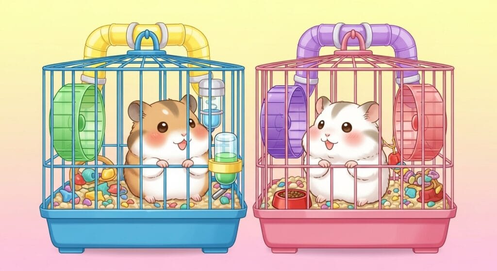 狭い部屋に二人っきりだと息が詰まるよね。ハムスターも同じ。もし2匹で飼うなら、お互いが出会わないで済むくらいの、かなり広いケージが必要だよ。隠れ家(ハウス)も、2匹分じゃなくて、3個も4個も置いて「逃げ場」をたくさん作ってあげることが大事。