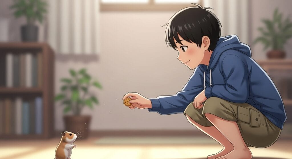 基本は、ハムスター専用の「ペレット」っていう固形のごはん。 ひまわりの種は大好きだけど、脂っこいから人間でいうポテトチップスみたいなものなんだ。あげすぎると太っちゃうから、仲良くなるための「魔法の道具」として、たまにあげるくらいがちょうどいいよ。