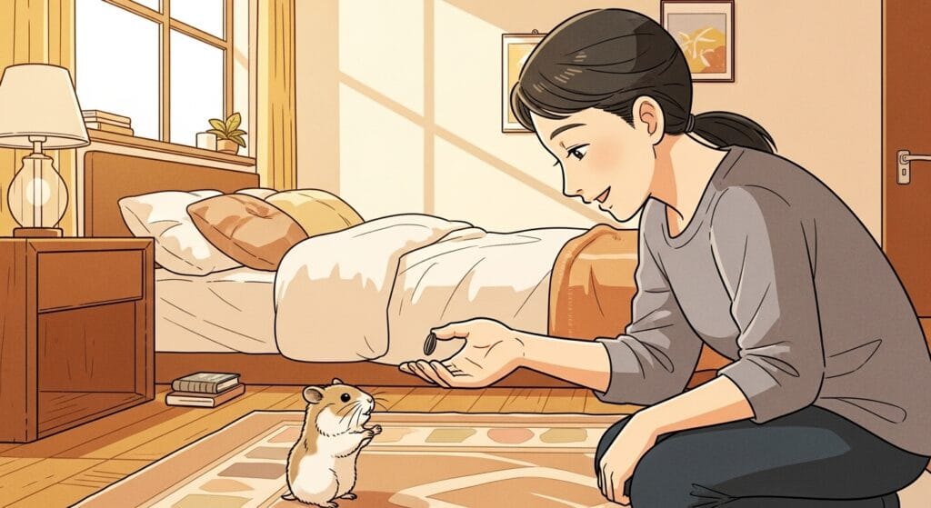 大好きなひまわりの種を指先で持って、じーっと待ってみて。ロボちゃんが「くんくん…」って寄ってきて、手から受け取ってくれたら大成功!その瞬間は、めちゃくちゃ感動するよ。