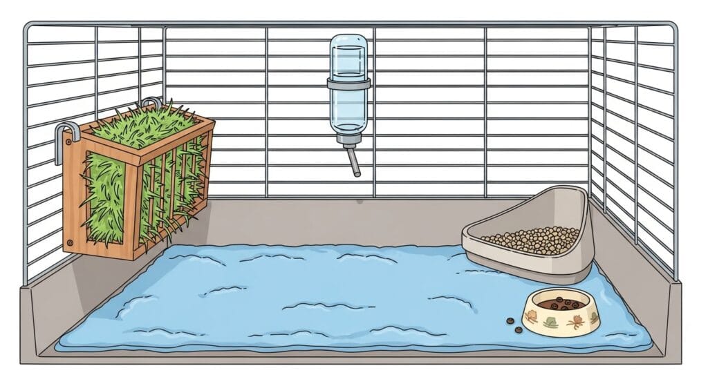 - 床材の工夫: ケージの床は、足の負担が少ない牧草マットや柔らかい素材のすのこなどを利用しましょう。網目のスノコは避けた方が安心です。