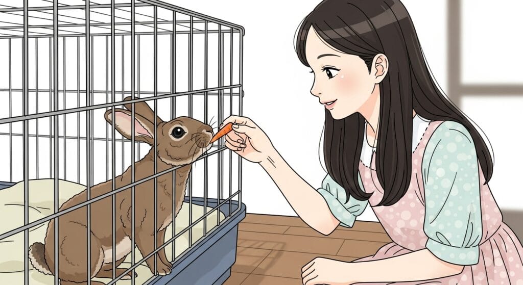 ミニレッキスさんは、穏やかで人懐っこいとはいえ、うさぎさんはもともと「警戒心の強い生き物」だっていうことを忘れちゃダメだよ。だから、まずはおうちに来たばかりの時や、普段の生活でも、「ここは安全だ」って思える場所を作ってあげることがとっても大事。