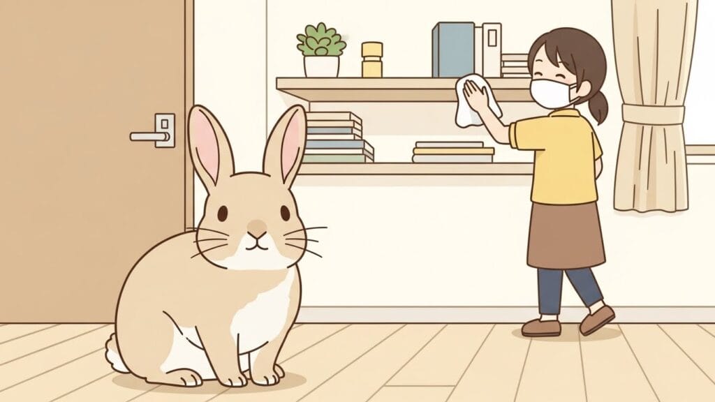 - 寝室には置かない:寝ている間は無防備だから、アレルギー物質を長時間吸い込むのを避けるため、ケージはリビングや別の部屋に置くのが理想的だよ。