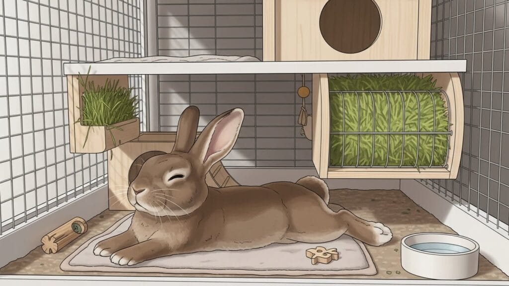 最低でも、ウサギさんが横になっても、まだちょっと余裕があるくらいの大きさが理想的。それに、ご飯を食べる場所、お水を飲む場所、トイレ、そして隠れる場所(ハウス)を置いても、ウサギさんが動き回れるスペースを確保してあげることが大切です。