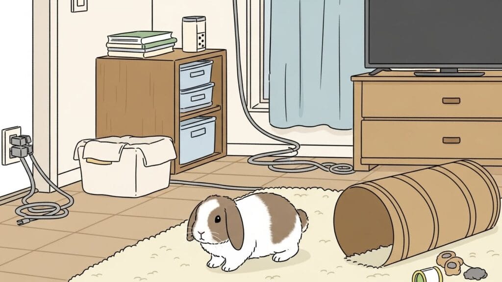 - 安全確保が最優先: へやんぽをする前に、電気コードやかじってはいけないものは必ず隠すか、カバーをしてね。うさぎさんはカジカジするのが大好きだから、目を離さないように!