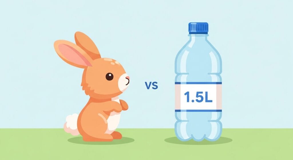 身近なもので例えると、1.5リットルのペットボトル1本分くらいだね。片手で持つとちょっとずっしりくる感じ。これくらいで成長が止まる子は、ミニウサギの中でもかなり小柄な方だと思っていいよ。