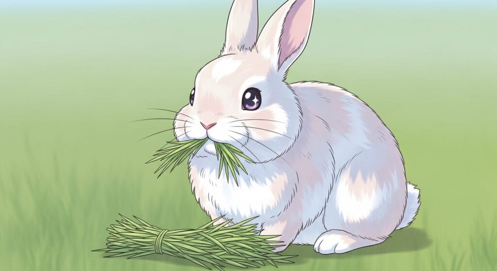 うさぎさんのメインのご飯は「チモシー」っていう乾燥した草。これをムシャムシャ食べるのが仕事みたいなものなんだ。