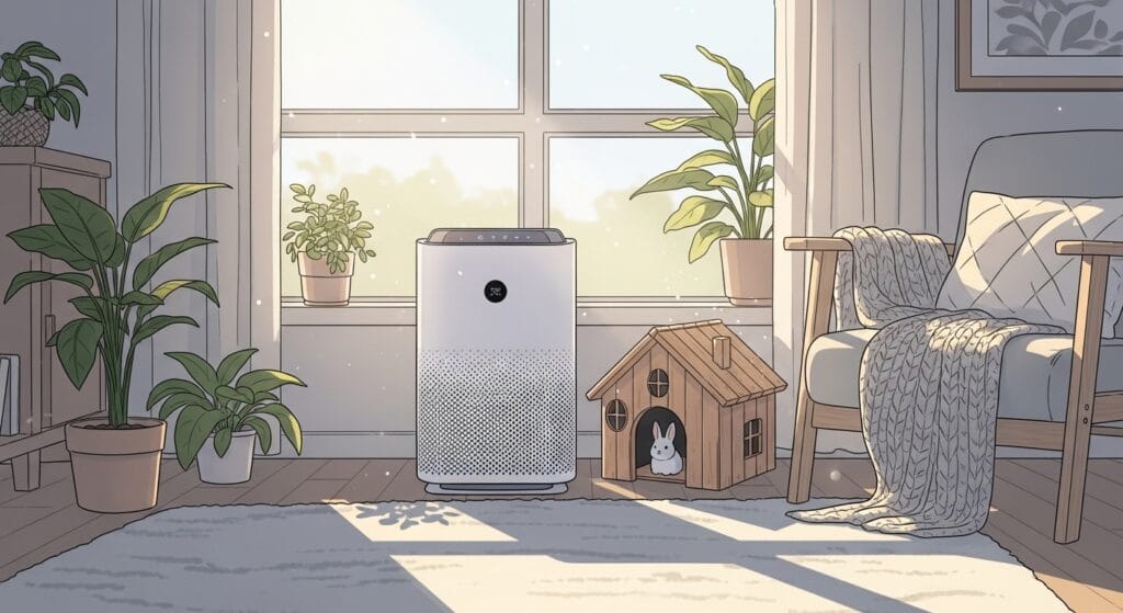 やっぱり最強なのは空気清浄機!最近のモデルは脱臭機能がすごいから、一台あるだけで全然違うよ。ウサギさんの毛も吸い取ってくれるから、アレルギー対策にもなって一石二鳥。