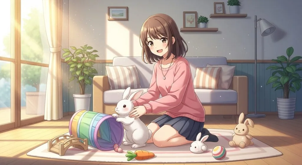 ただお部屋に出すだけでなく、トンネルを置いたり、段差を作ったりして、体を動かしたくなる工夫をしてみましょう。飼い主さんが一緒に床に座って遊んであげるだけでも、うさちゃんはテンションが上がって走り回ってくれます。