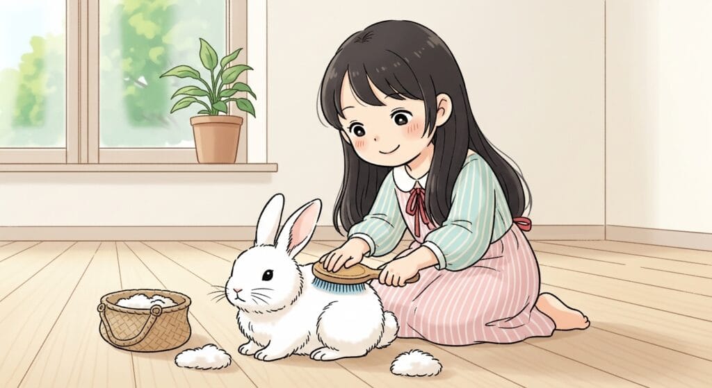 また、うさぎさんは1年中毛が抜けます。特に「換毛期(かんもうき)」っていう毛が生え変わる時期は、信じられないくらいの毛が抜けるんです。放っておくと部屋中が毛だらけになるし、うさぎさんが自分の毛を飲み込んでお腹を壊しちゃう(うっ滞っていう怖い病気になります)こともあるから、ブラッシングは必須ですよ!