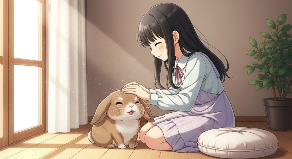 仲良くなってきたら、ゆっくり手を伸ばして、おでこのあたりを優しくなでてみて。 ウサギさんはおでこをなでられるのが大好きな子が多いんだ。「気持ちいい〜」ってなると、目を細めてペタンと寝そべってくれるよ。