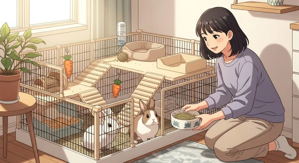 ウサギさんは1日のほとんどをケージの中で過ごすから、リラックスできる場所にしてあげなきゃいけない。 広さは、ウサギさんが3回くらいジャンプできるくらいが理想かな。 足の裏を痛めないように、床には専用のスノコやマットを敷いてあげてね。