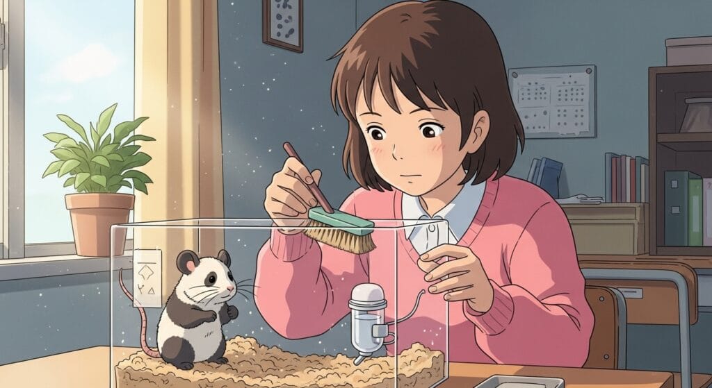 でも、全部をいっぺんにピカピカにしちゃうと、自分の匂いが消えてパンダマウスが不安になっちゃうんだ。汚れた部分だけ毎日掃除して、全部取り替えるのは週に1回くらいにするのが、パンダマウスに優しいお掃除の方法だよ。