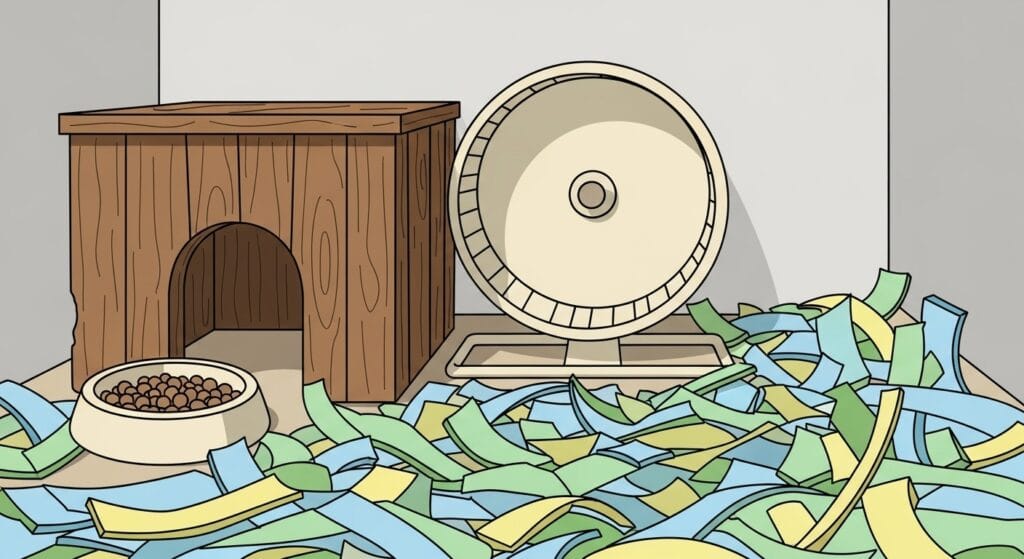 床には「床材」っていう、クッションみたいなものを敷いてあげよう。ウッドチップや紙製のタイプがあるけど、アレルギーが少ない紙製が使いやすいかも。パンダマウスはそこに潜って寝るのが大好きだから、たっぷり入れてあげてね。
