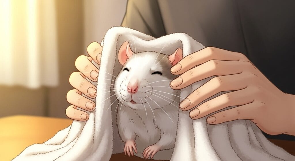 これが一番オススメ! 38度〜40度くらいの、ちょっとぬるめのお湯で濡らしたタオル(またはガーゼ)を固く絞って、汚れているところを優しく拭いてあげて。 これなら全身がびしょ濡れにならないし、ラットちゃんへの負担も最小限で済むんだ。 拭いた後は、必ず乾いたタオルで水分をしっかり取ってあげてね。
