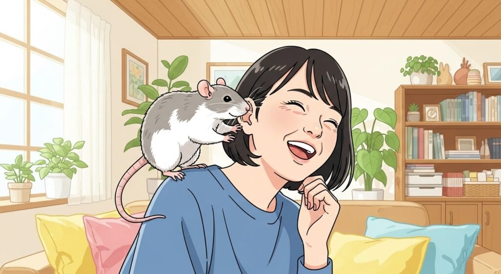 実はファンシーラットって、めちゃくちゃ頭が良くて、感情豊かな動物なんだよ。例えるなら「ポケットサイズのワンちゃん」みたいな感じ。仲良くなれば名前を呼んだらトコトコ寄ってくるし、肩に乗って一緒にお散歩(お家の中でね!)だってできちゃう。
