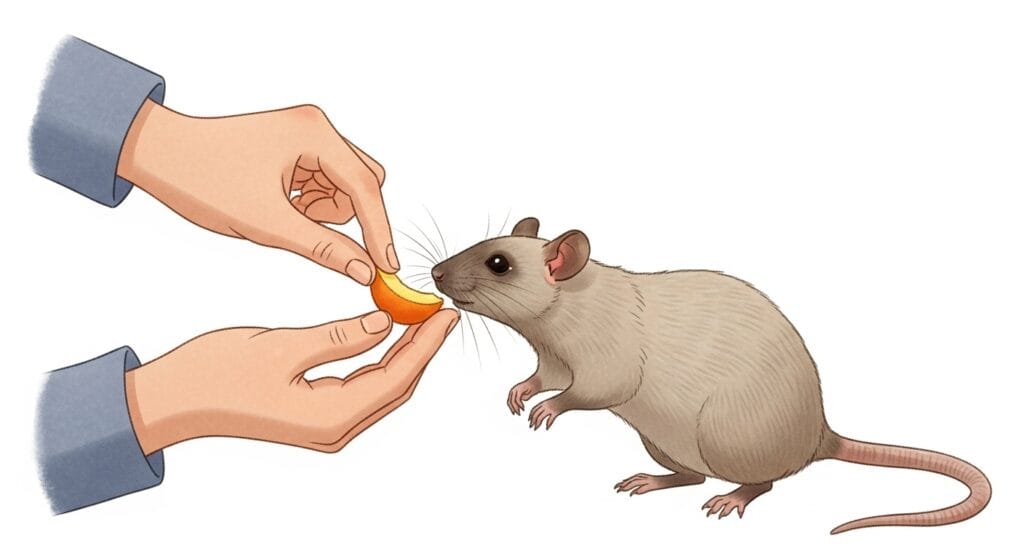 ラットは自分の名前を覚えることができるんだ。ご飯の時やお掃除の時に「〇〇、おいで〜」って優しく声をかけてあげてね。毎日続けていると、名前を呼ぶだけでケージから顔を出してくれるようになるよ。