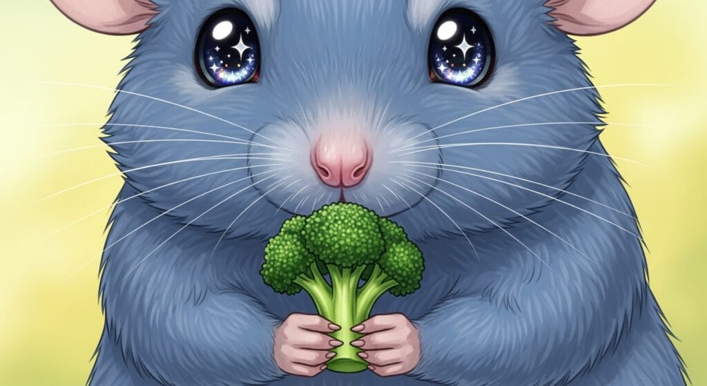 この色の秘密は、毛の一本一本に微妙な色の魔法がかかっているから。ファンシーラットの世界では、このブルー系はすごく人気があって、飼い主さんたちの間でも「憧れのカラー」なんて言われることもあるんだ。
