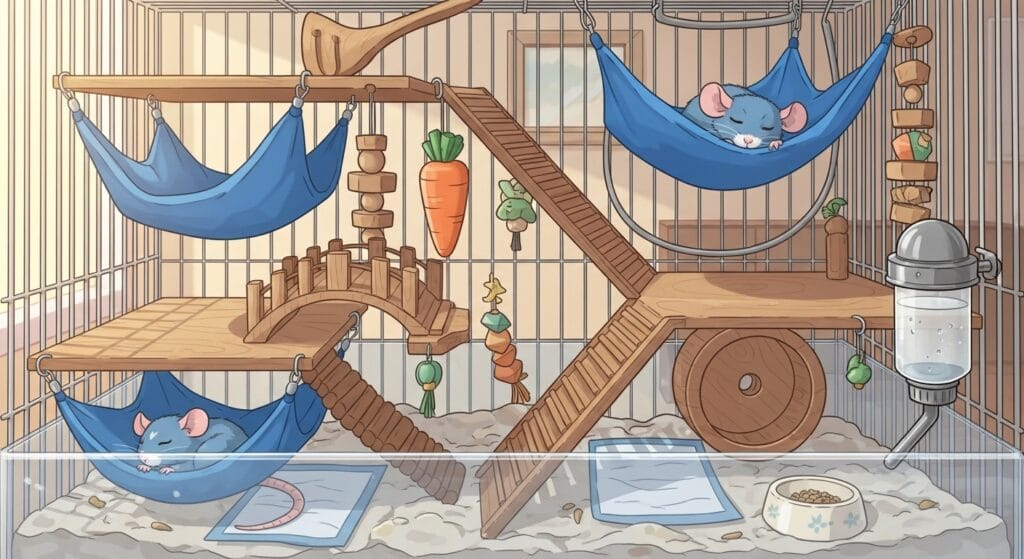 中にステップ(足場)やハンモックを吊るしてあげると、そこがお気に入りの寝床になるよ。ブルーのラットがハンモックから顔を覗かせている姿は、もう「尊い…」の一言に尽きるよ。