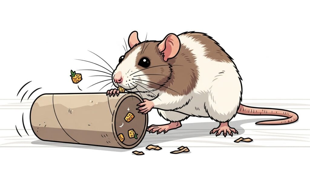 ケージの中にそのまま置くんじゃなくて、トイレットペーパーの芯の中にペレットとおやつを詰めて、両端を折って隠してみよう。ラットは頭がいいから、一生懸命かじって中の食べ物を取り出そうとするんだ。 これは退屈しのぎにもなるし、野生の「食べ物を探す」っていう本能を刺激できるから、ストレス解消にもなって一石二鳥だよ。