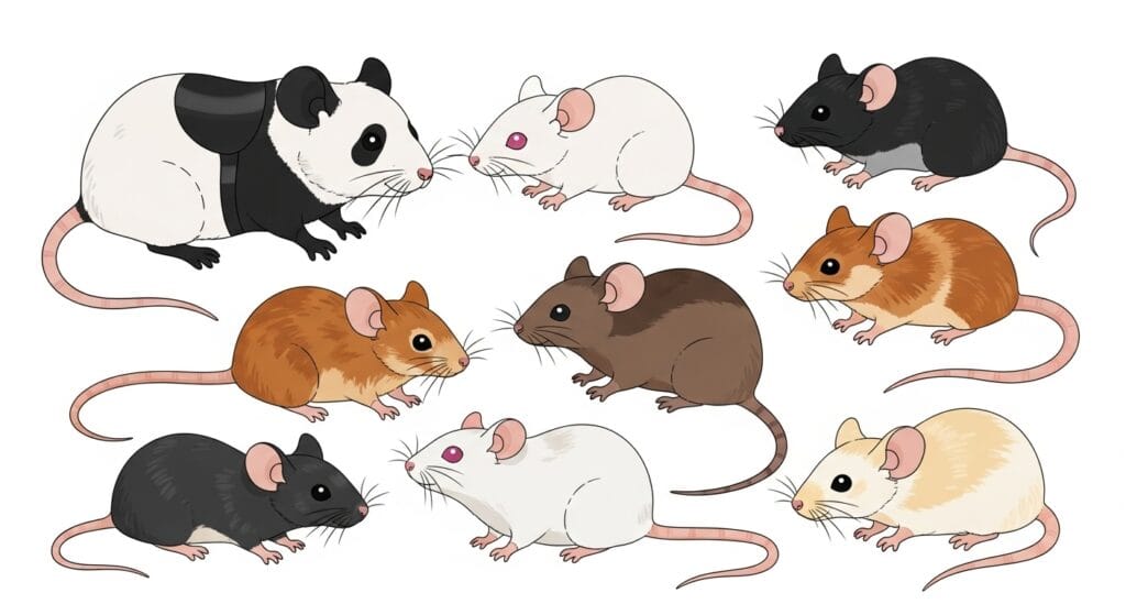 ハツカネズミの仲間には、白黒模様が可愛い「パンダマウス」や、品種改良された「ファンシーマウス」がいるよ。 パンダマウスは普通のハツカネズミよりもさらに一回り小さくて、大人になっても5〜7センチくらい。逆にファンシーマウスの中には、ちょっとふっくらして10センチを超えるような子もいるんだ。