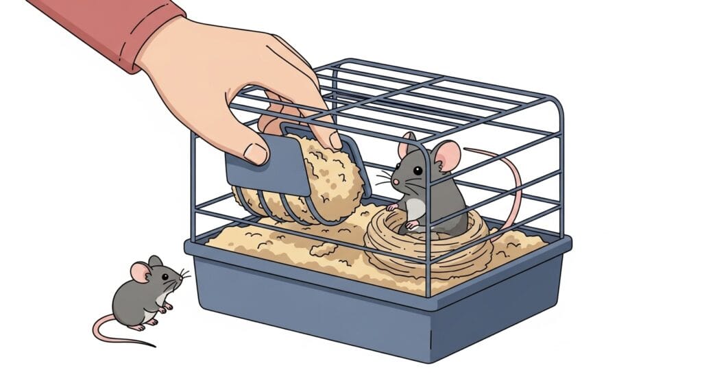 せっかく自分の匂いをつけて「ここが俺の場所!」って安心してるのに、掃除で全部捨てちゃうと、ハツカネズミは「俺の家が消えた!?」って大パニックになっちゃう。掃除の時は、汚れた部分だけ捨てて、まだ綺麗な古い材料を少し残して混ぜてあげるのがコツだよ。