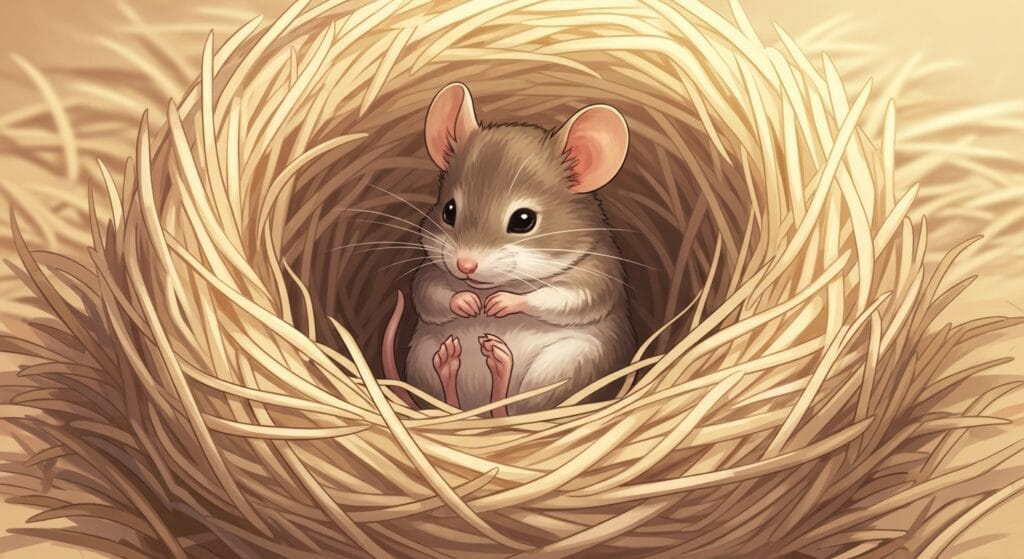 ハツカネズミって、実はすごく寒がりなんだ。体が小さいから、すぐに体温が奪われちゃう。だから、ふわふわの素材を集めて、自分の体温を逃がさないように工夫して眠るんだよ。特に冬場は、巣がスカスカだと風邪をひいちゃうこともあるから、断熱材代わりになるような巣作りが超重要なんだ。